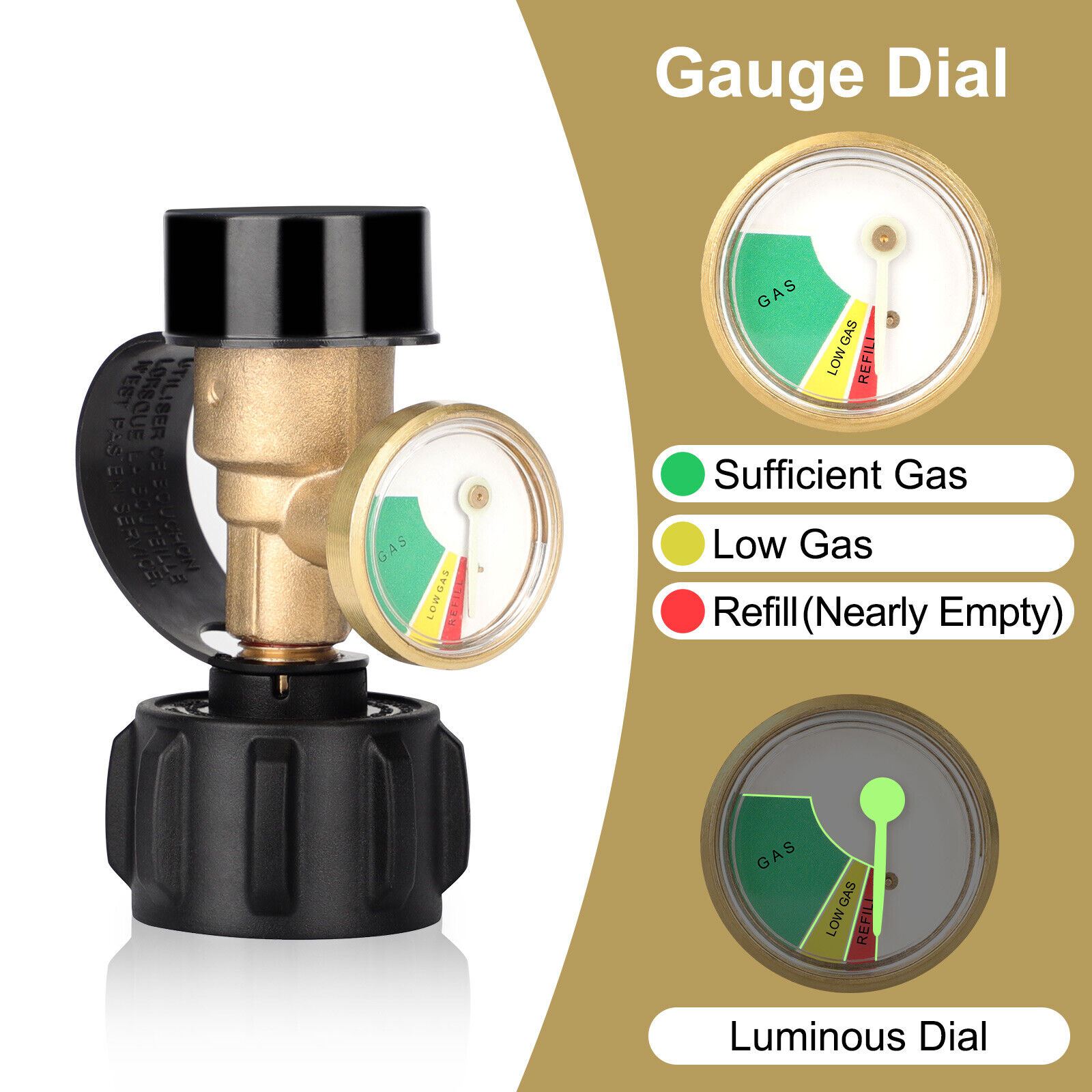- ⏲️【New Update】▶ Use the color Rotatable Luminous Dial which make it easier to know if the Rotatable Luminous dial is in the red (empty), yellow (low) or green (sufficient) at night. Without the Propane Gauge, you need to lift and shake the propane tank.
